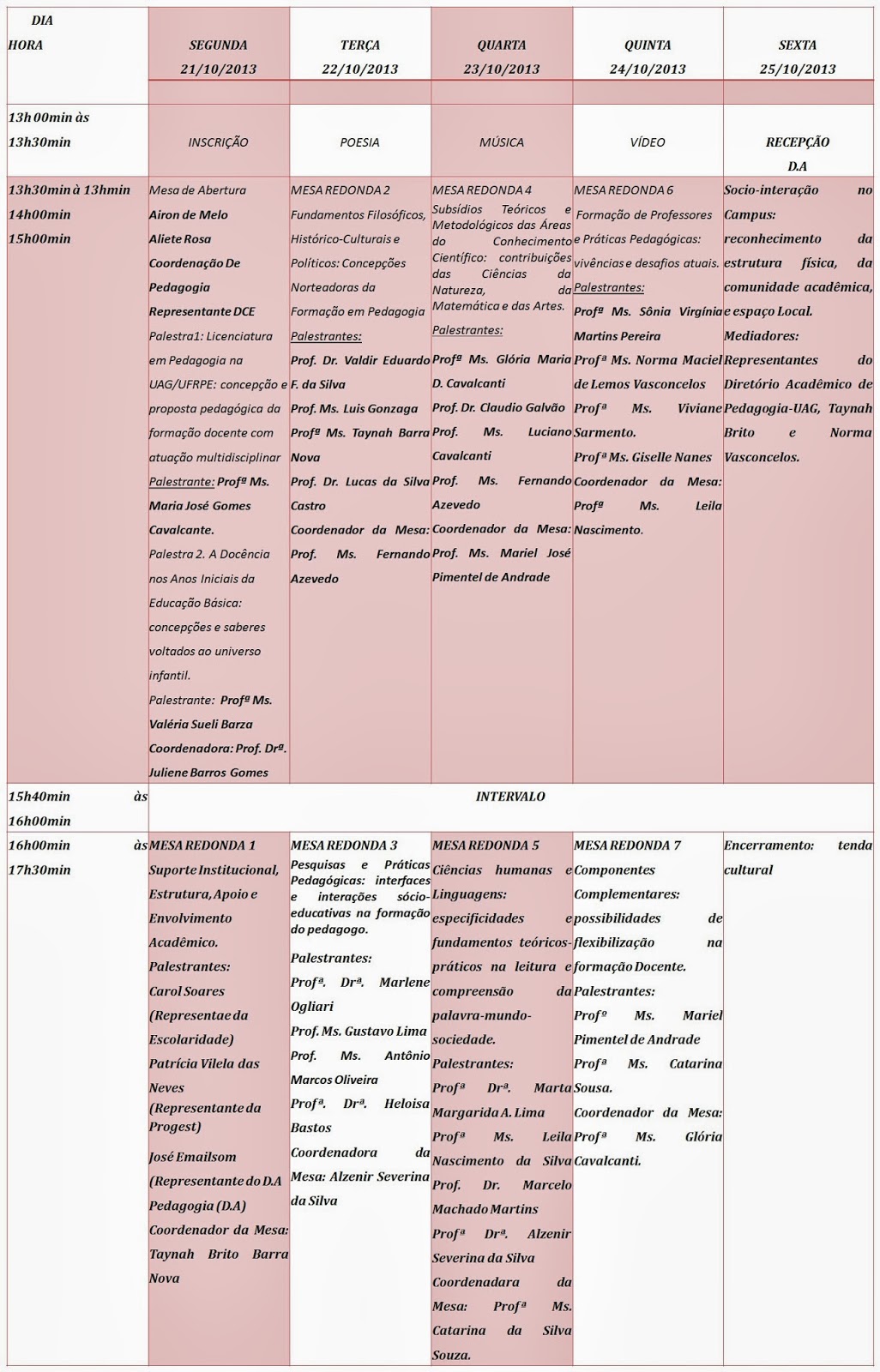 Com o tema: “DOCENTE COM ATUAÇÃO MULTIDISCIPLINAR: DESAFIOS ATUAIS À PEDAGOGIA” o evento coordenado por Alzenir Severina da Silva e Glória Maria Duarte Cavalcanti (com a colaboração de: Catarina da Silva Sousa; Taynah Brito Barra Nova; Norma Vasconcelos; Mariel Pimentel de Andrade; D. A Pedagogia-UAG) visa apresentar o projeto político pedagógico e os componentes curriculares que estruturam o Curso de Pedagogia da Unidade Acadêmica de Garanhuns (UAG/UFRPE), para que conheçam e discutam a proposta de formação docente, e se posicionem com relação aos saberes, conhecimentos específicos, teorias e práticas que dão sentido à construção do conhecimento e da cultura que se materializam nos espaços escolares e não escolares. Cumprindo com o papel social da universidade como uma instituição pública e gratuita que visa o intercâmbio técnico-científico-cultural e informacional e a ampliação da produção e difusão do conhecimento. As palestras e mesas redondas que compõem o evento conformam-se como espaço de diálogo e interação universidade-sociedade. Durante o evento, professores do curso apresentam suas linhas de pesquisas e de atuação e debatem os desafios da formação docente, especialmente dos anos iniciais da Educação Básica. É uma oportunidade para que todos os segmentos envolvidos com a educação escolar (local e regional) reconheçam as possibilidades de atuação dos discentes do Curso de Pedagogia UAG/UFRPE, durante sua jornada de formação e intervenção, nas diferentes áreas e projetos em períodos de estágios curriculares e/ou extracurriculares.